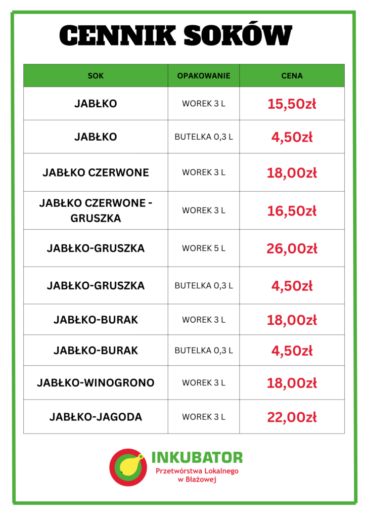 Bez kategorii AKTUALNY CENNIK SOKÓW DOSTĘPNYCH W SPRZEDAŻY Opublikował/a Redaktor dnia 7 stycznia 20269 stycznia 2026 Serdecznie zapraszamy do zapoznania się z aktualnym cennikiem soków, które są dostępne w sprzedaży w naszym Inkubatorze!